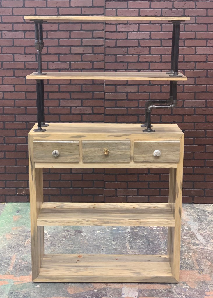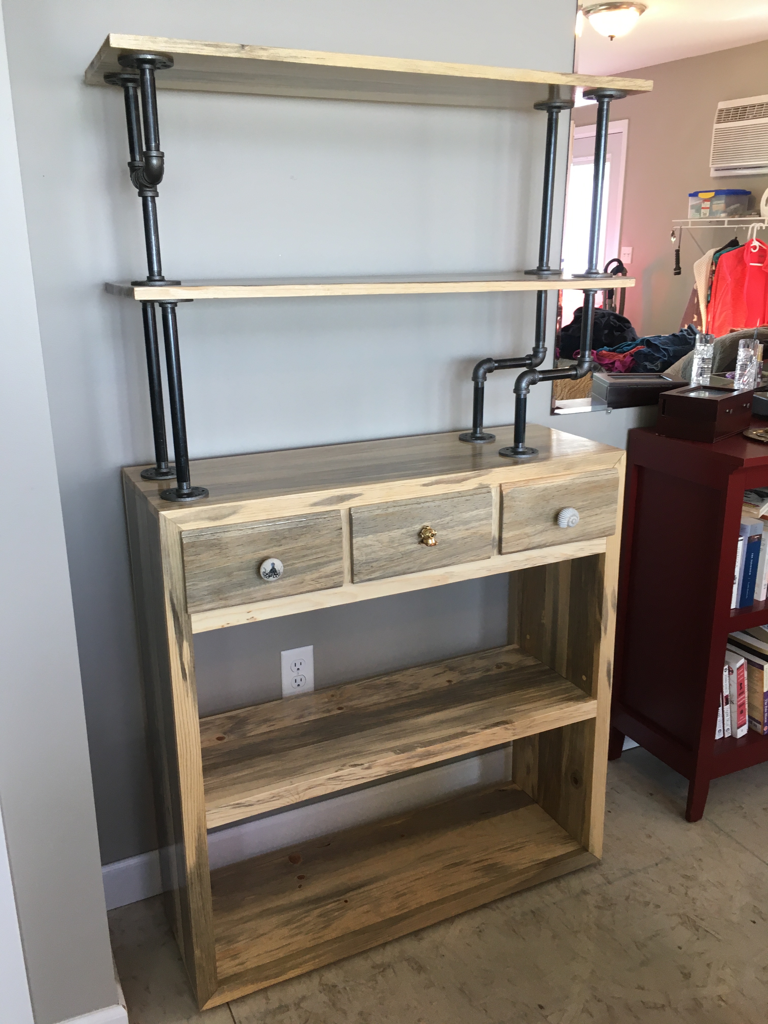 To say that I don’t build anything, is an understatement–I never build anything! Stories are my thing and maybe some crafty things every once in awhile. And I’m not much of an artist, so design stuff? Ha. The first problem I came up against was that my builder actually wanted me to design what I wanted! Yikes. What did I want in bookshelves? Quickly, I realized I couldn’t just say, oh this high and this wide, and maybe this many shelves. Nope. Specifics were needed. So I dutifully bought a tape measure and began measuring and dreaming. My heart set on a secret drawer, but of course I was imaging something out of the National Treasure movies, not something actually, you know, buildable. Slowly, my mind turned to practicality, but also to steampunk. Steampunk is a difficult genre to describe. It’s sort of modernity mixed with rustic, Victorian era decor, and that usually manifests in things like a modern computer decked out in gears and clocks. And pipes. The pipes stuck with me and ended up being the fixtures holding up the top two shelves.