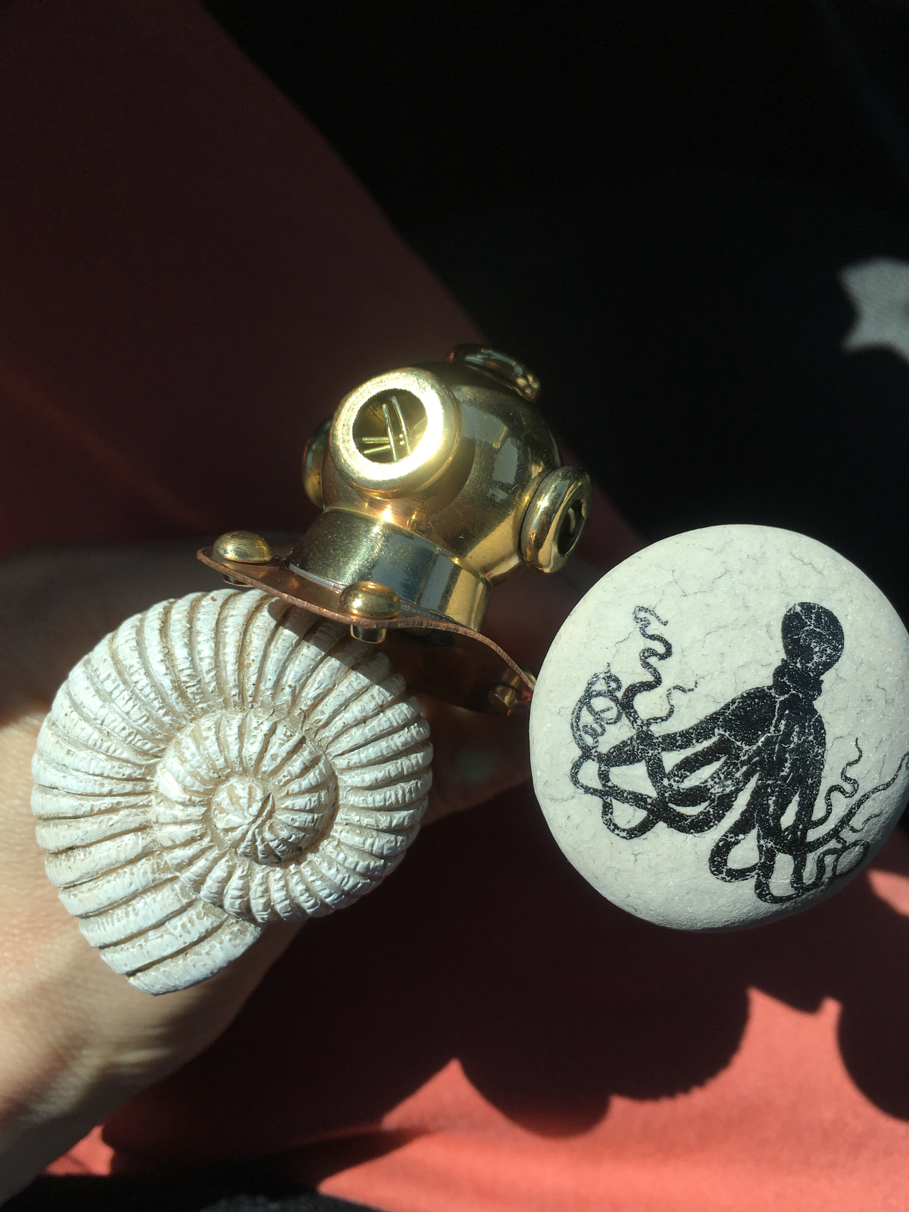 As for the drawer knobs, what a job that was trying to decide. Do you know Hobby Lobby carries about a thousand cool drawer knobs? Seriously. But I ended up falling in love with the water diving guy and then it was an aquatic theme: 2,000 Leagues Under the Sea–er, in the trees–Steampunk. Steampunk with a capital S!