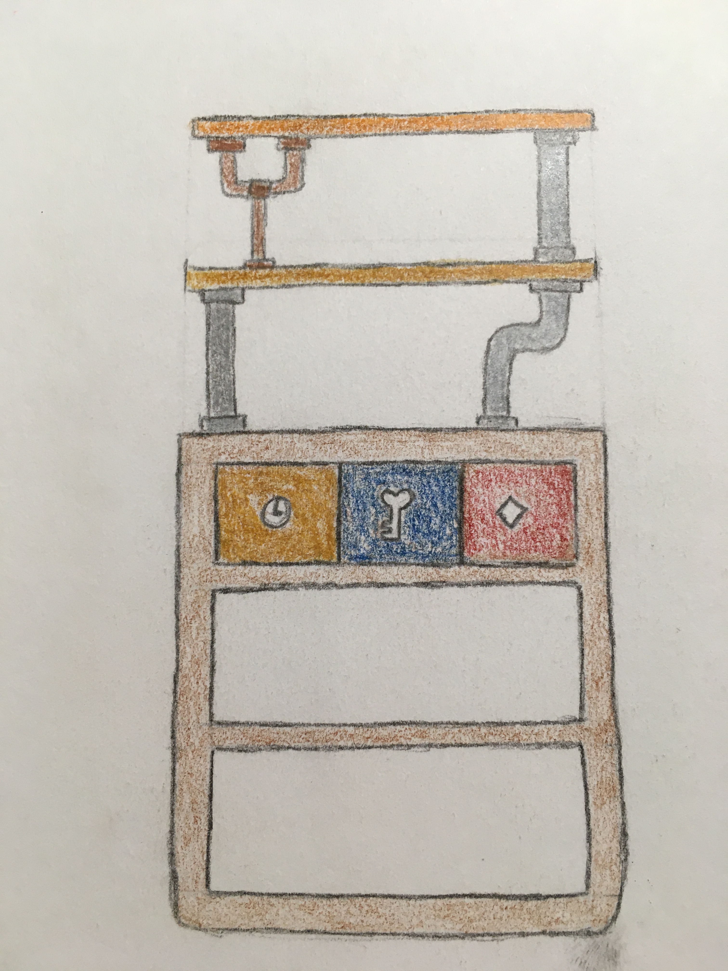 Secret drawer thrown aside, still my brain ran to the impractical. Long have I loved the Cambria quartz countertops and I thought that maybe that material could make the shelves. Not so, not so, for the sales clerk mournfully told me that first, the shelves would be insanely heavy, and secondly it would break my bank account. With a sigh, I threw that idea out, too. Here is my final design: